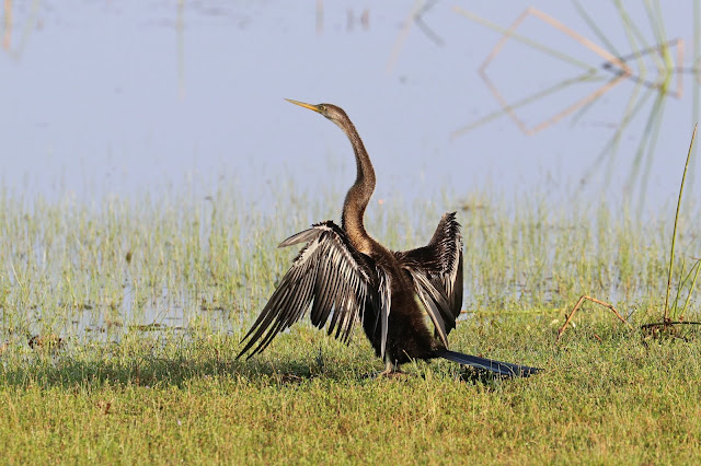 Late in the day, we stopped by a waterhole, hoping to get a sighting of a leopard coming in to drink. We sat for a while, watching Asian Paradise-Flycatchers darting around, catching insects on the water's suface.